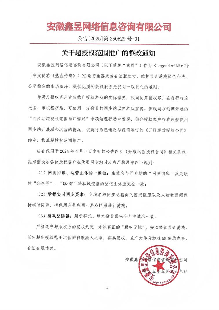 安徽鑫昱网络信息咨询有限公司(以下简称“我司”)作为《Legend of Mir 2》(中文简称《热血传奇》)PC端衍生游戏的合法版权方,维护传奇游戏绿色合法、公平稳定的市场秩序、提供优质的版权服务是我司一以贯之的准则。