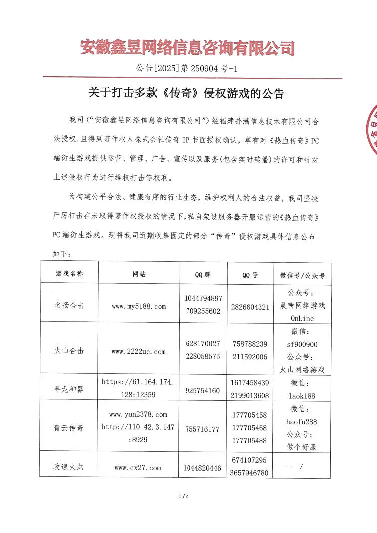 我司(“安徽鑫昱网络信息咨询有限公司”)经福建扑满信息技术有限公司合法授权,且得到著作权人株式会社传奇IP书面授权确认,享有对《热血传奇》PC端衍生游戏提供运营、管理、广告、宣传以及服务(包含实时转播)的许可和针对上述侵权行为进行维权打击等权利。
