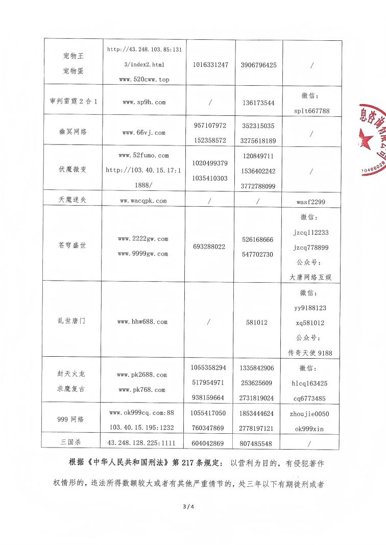 为构建公平合法、健康有序的行业生态,维护权利人的合法权益,我司坚决严厉打击在未取得著作权授权的情况下,私自架设服务器开服运营的《热血传奇》PC端衍生游戏。现将我司近期收集固定的部分“传奇”侵权游戏具体信息公布如下: