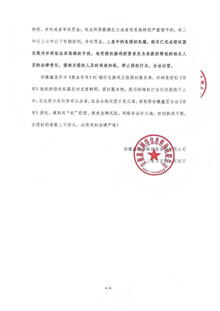 安徽鑫昱作为《热血传奇》PC端衍生游戏正版授权服务商,对肆意侵犯《传奇》版权的侵权私服反对态度鲜明,侵权服未绝,我司的维权打击行动就绝不止步。在此提示各位传奇从业者,依法合规运营才是正道,请取得安徽鑫昱合法《传奇》授权,做到有“权”经营,避免法律风险。网络非法外之地,如仍执迷不悟,在侵权的道路上不回头,必将受到法律严惩!
